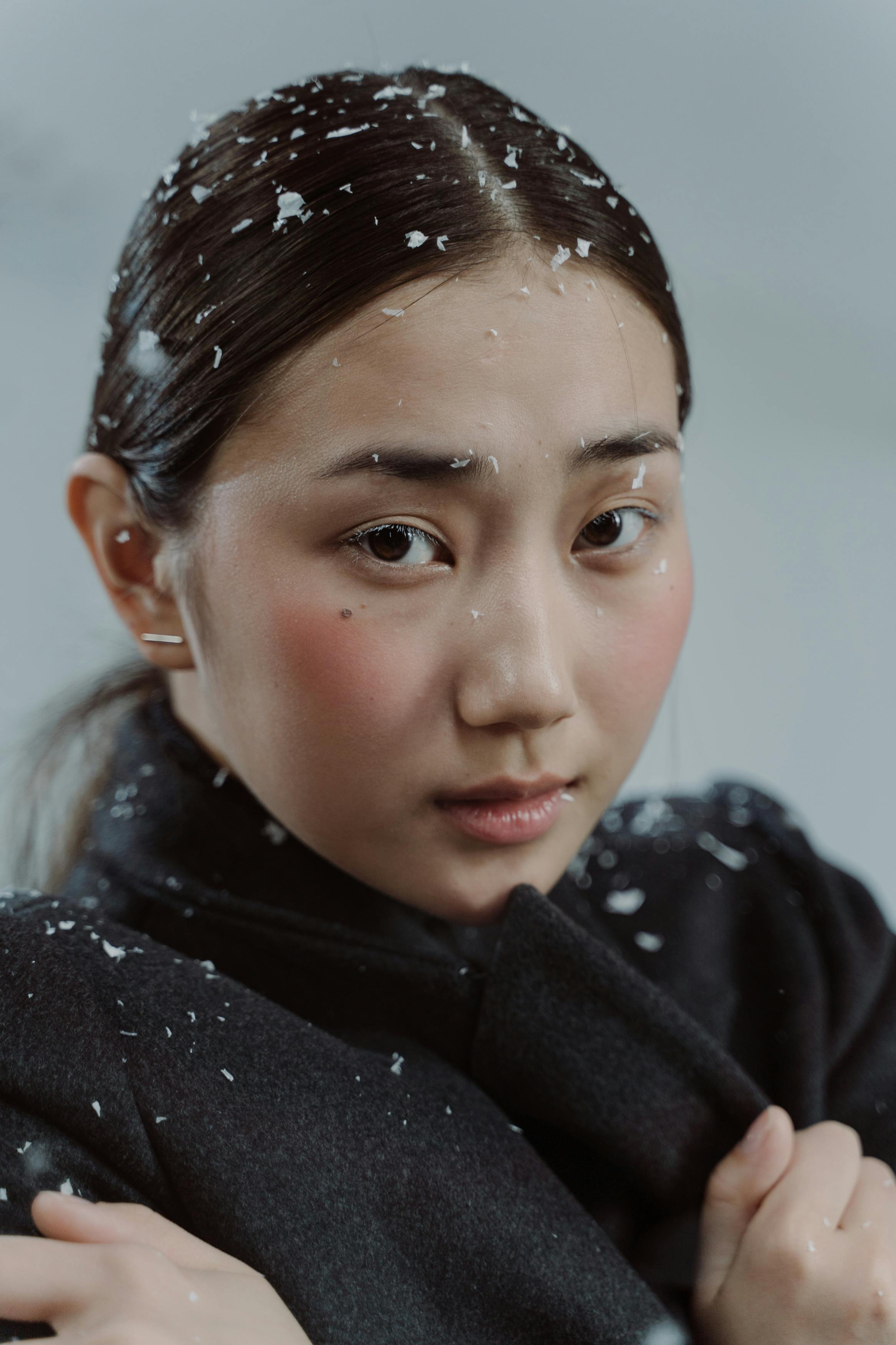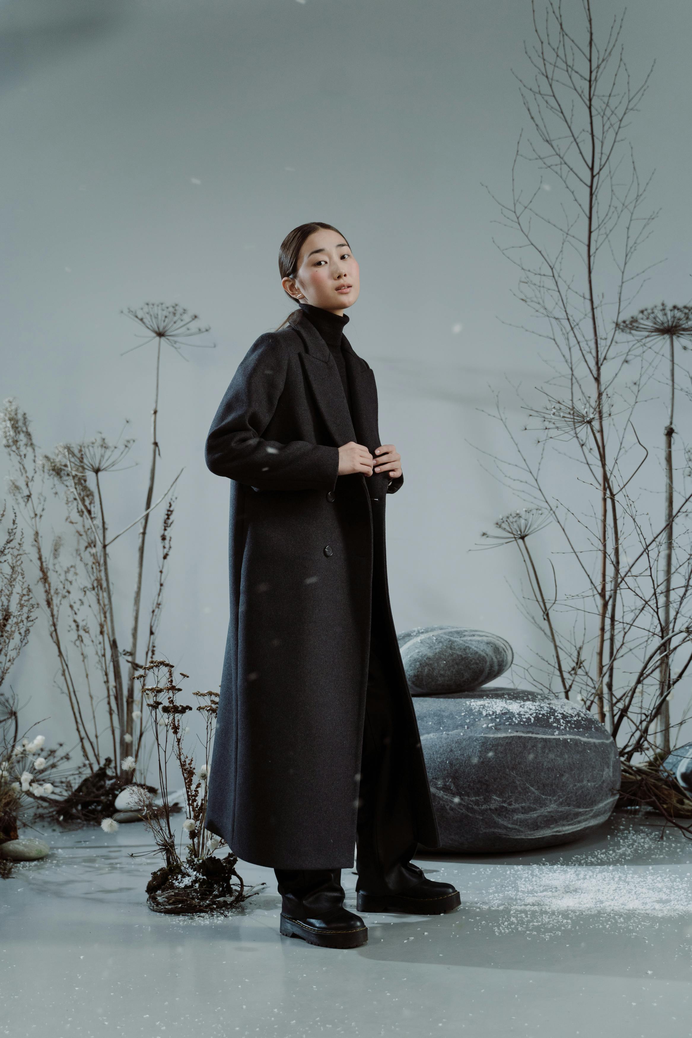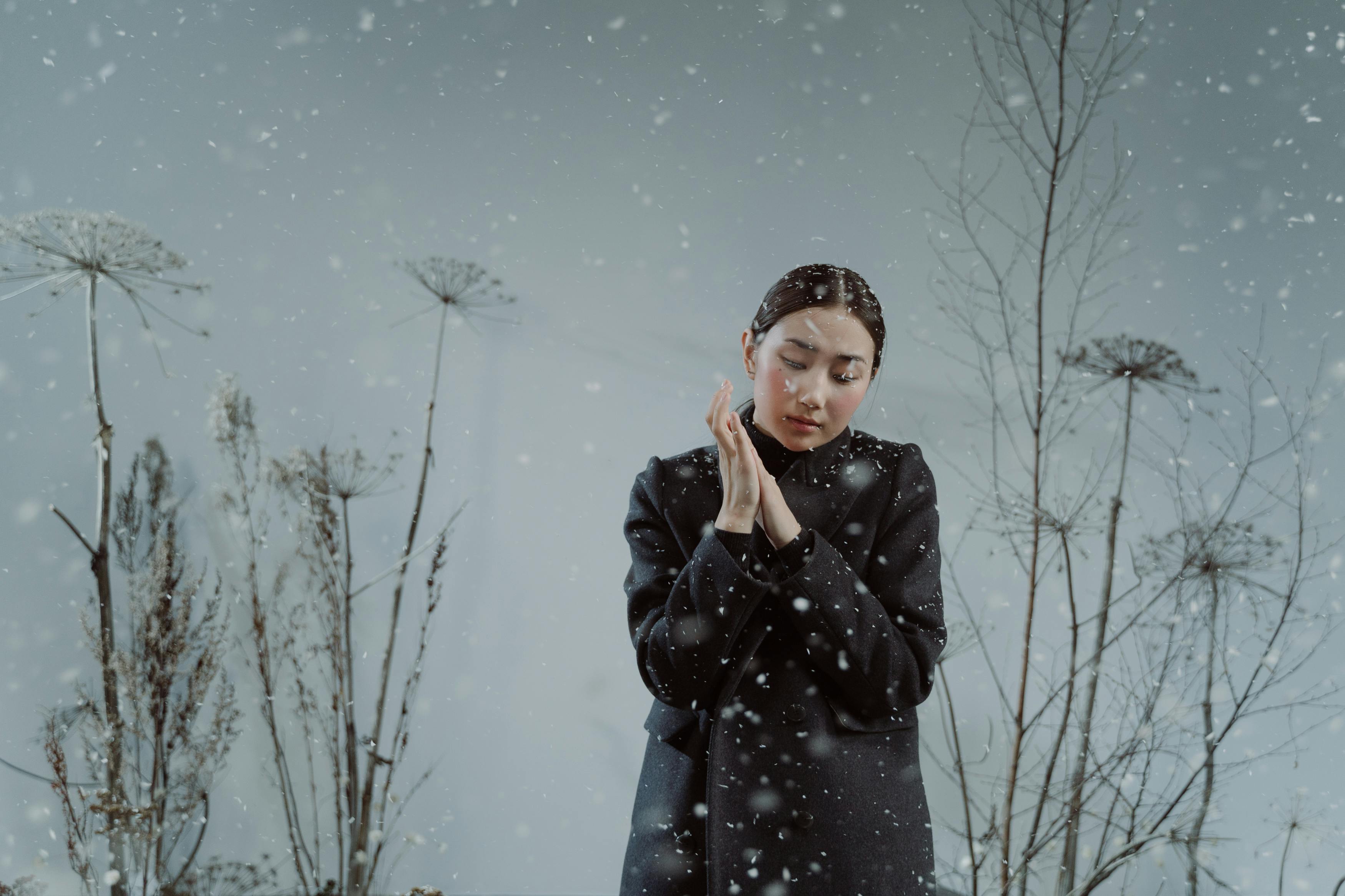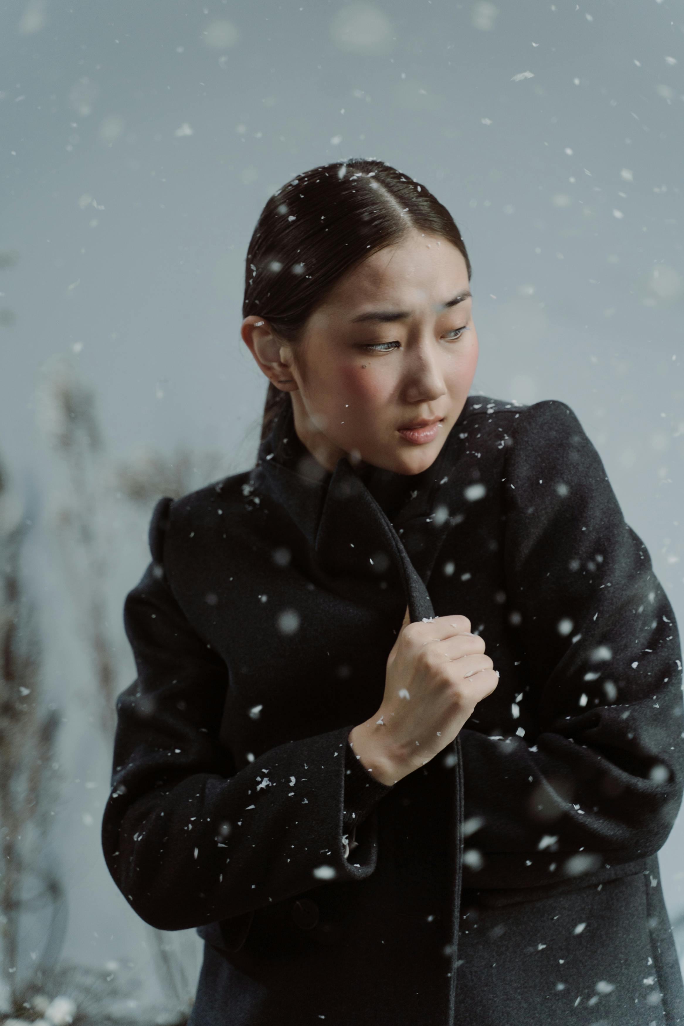 A meditation in monochrome—where falling snow and silent stares trace the contours of solitude. Each frame breathes cold clarity, wrapped in black fabric and emotional stillness.