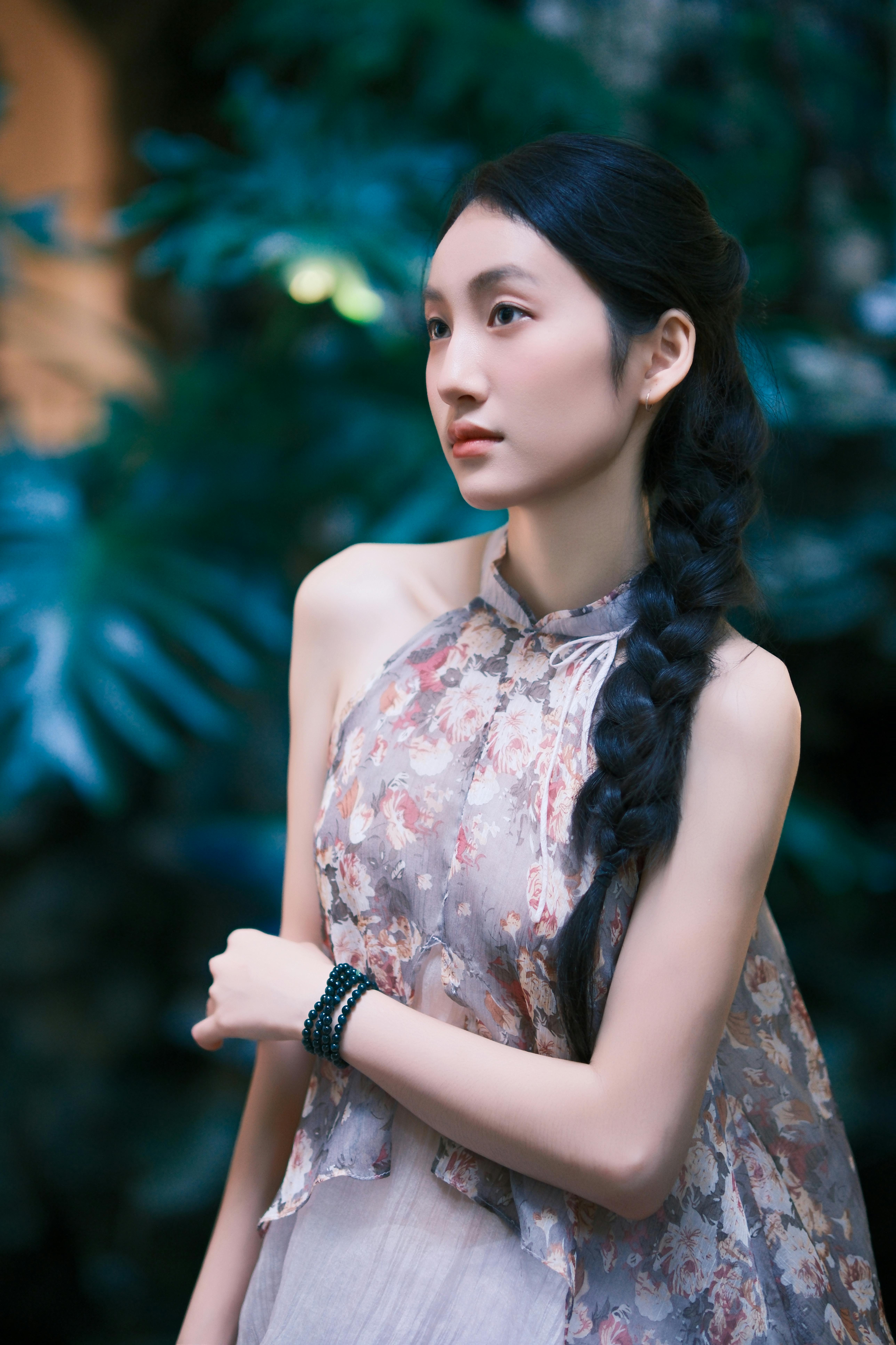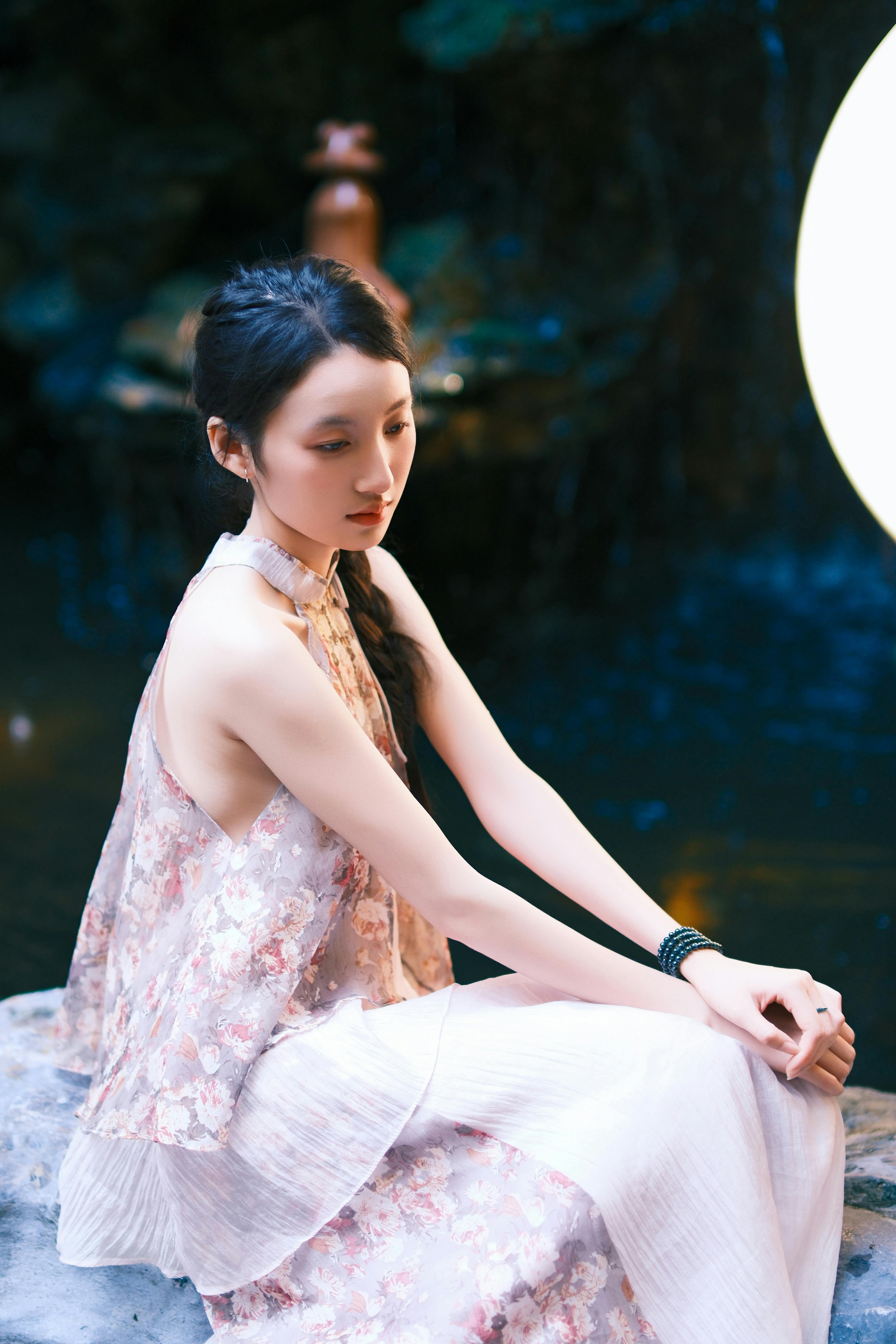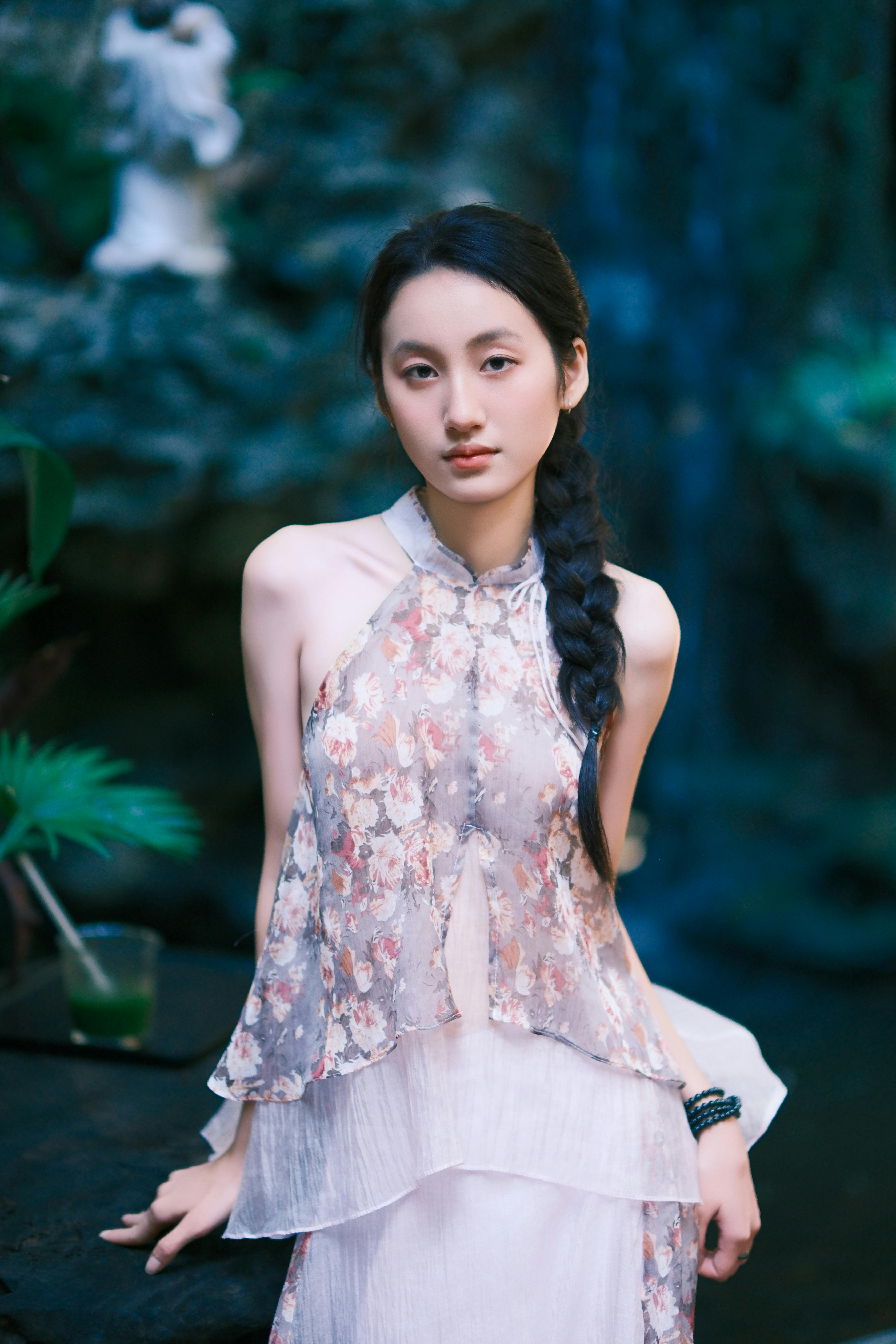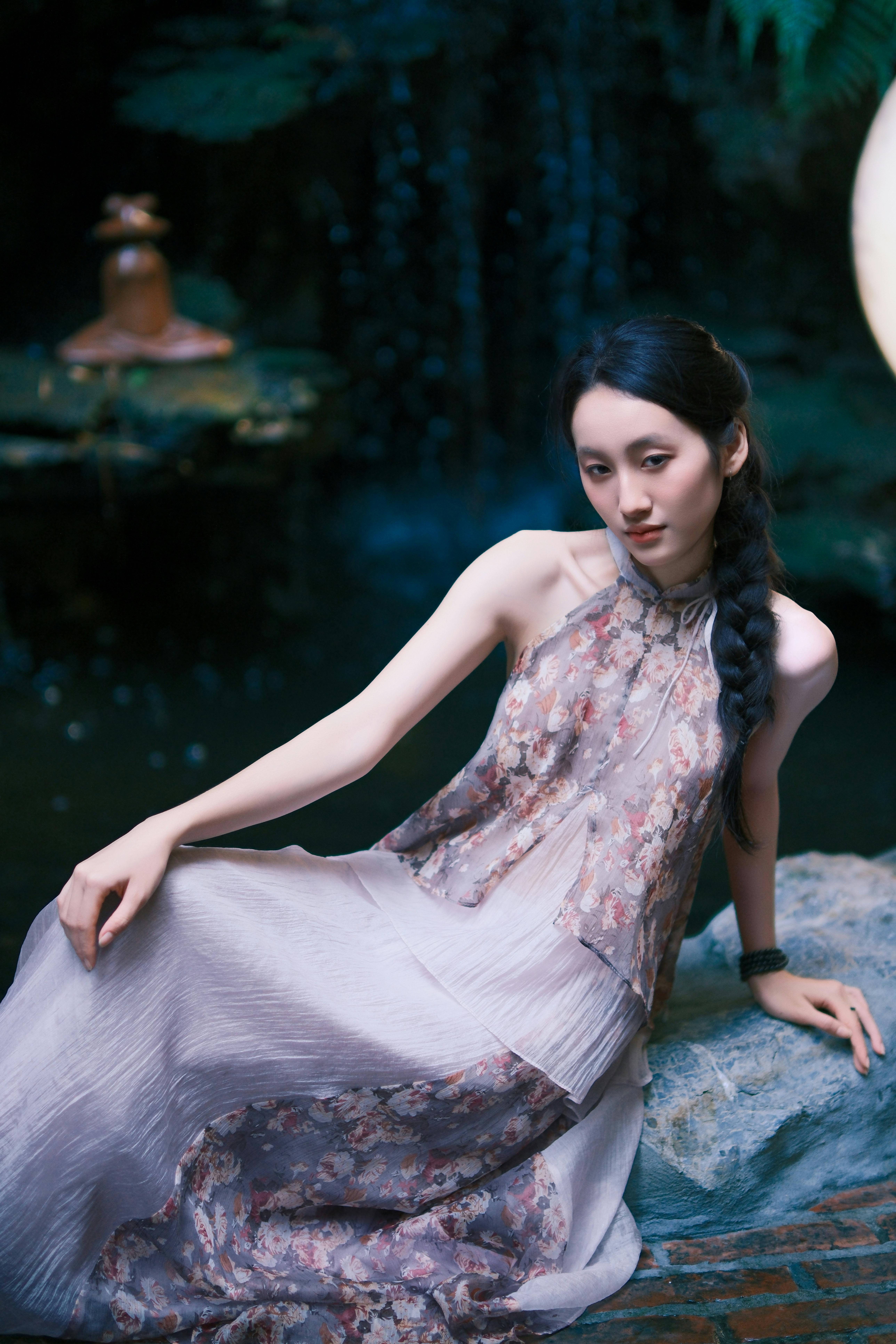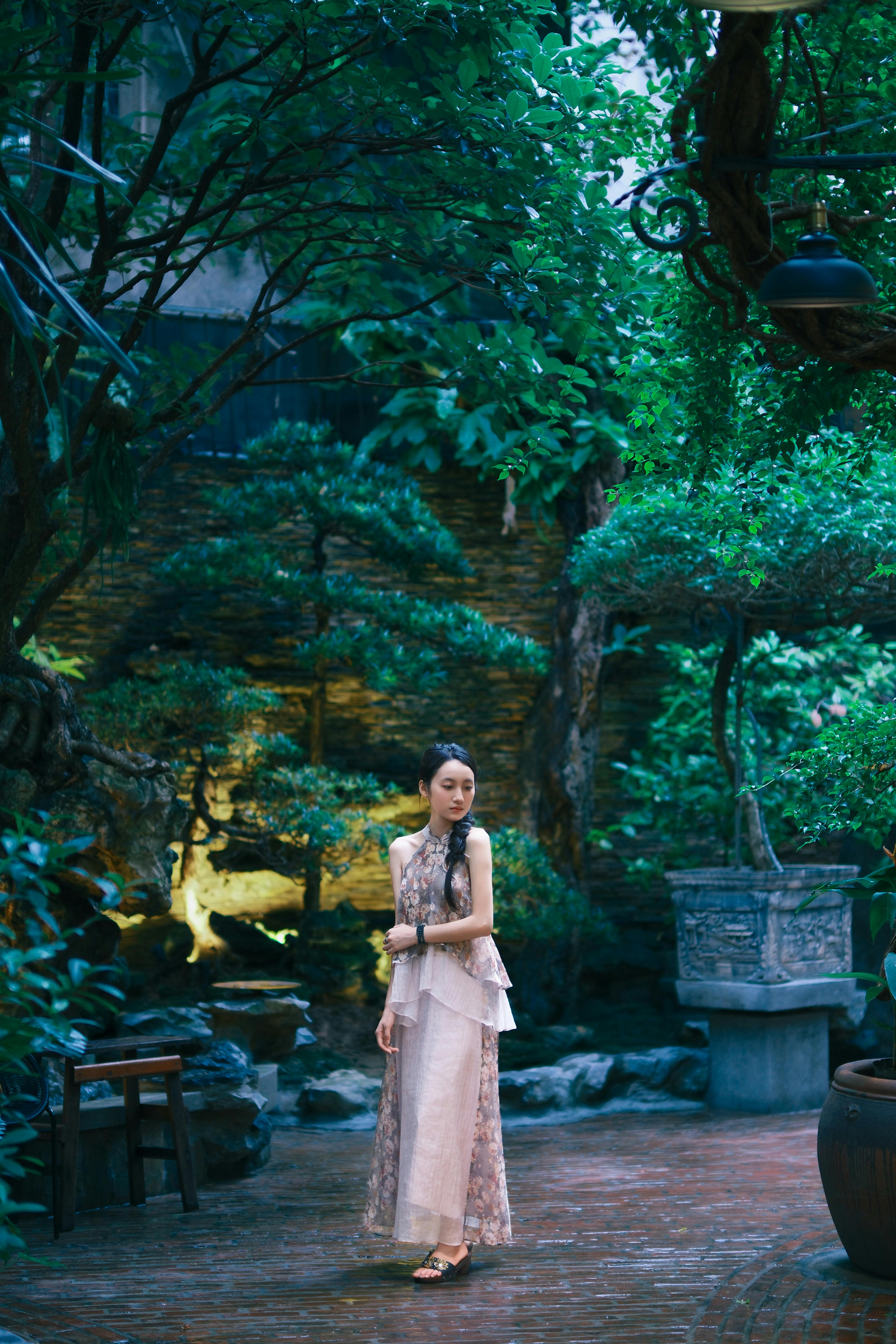 Elegant Dress, Outdoor, Lush Greenery, Soft