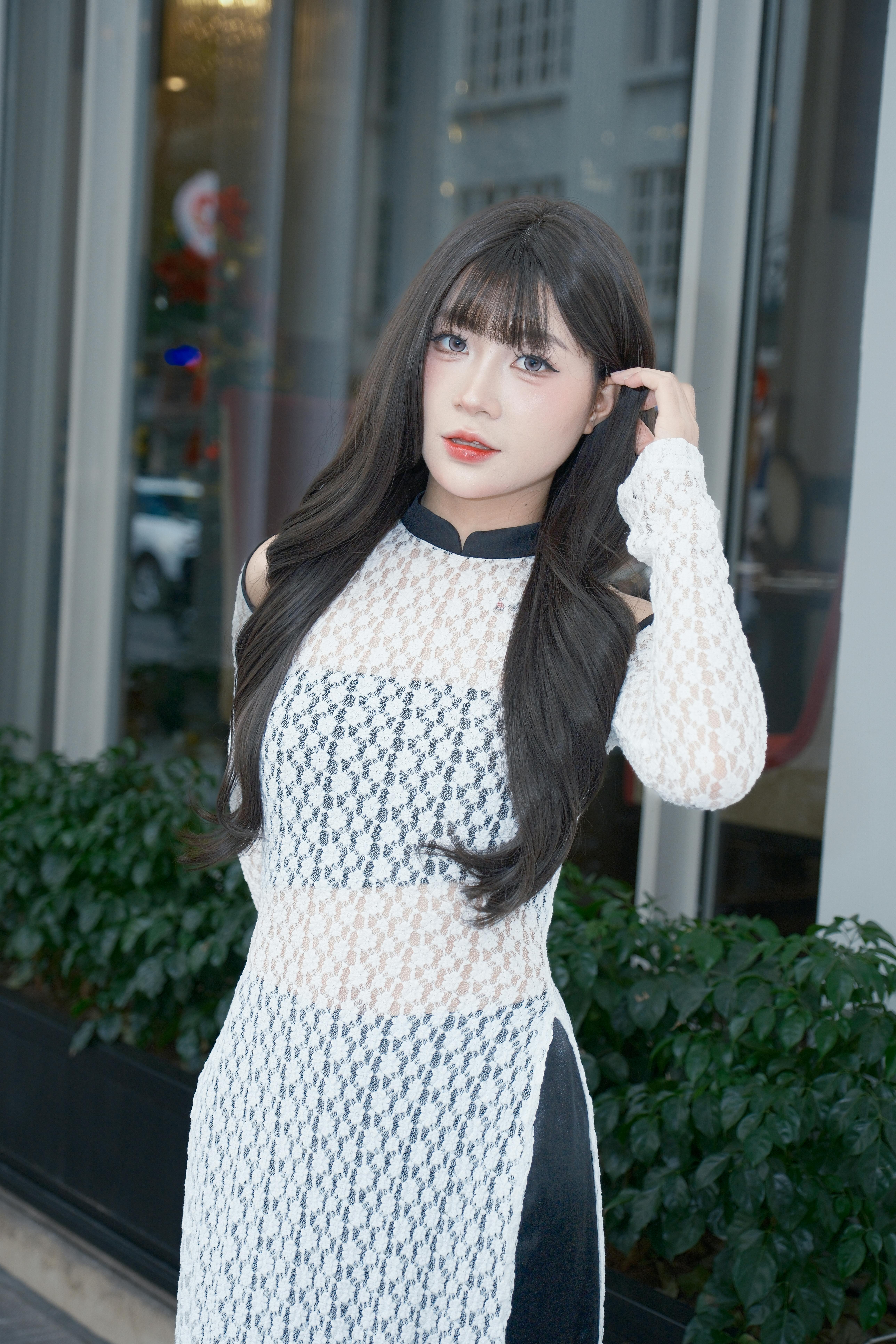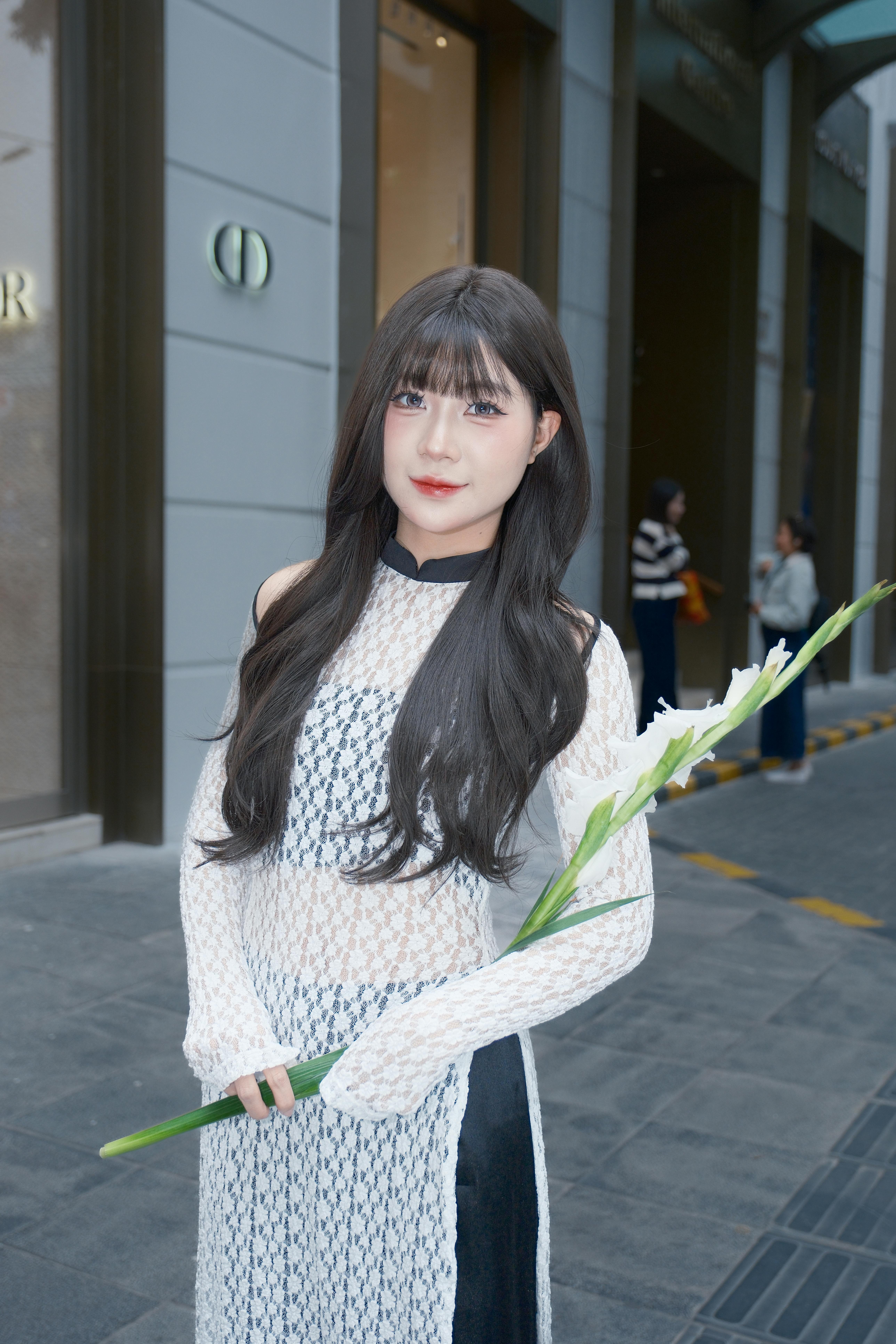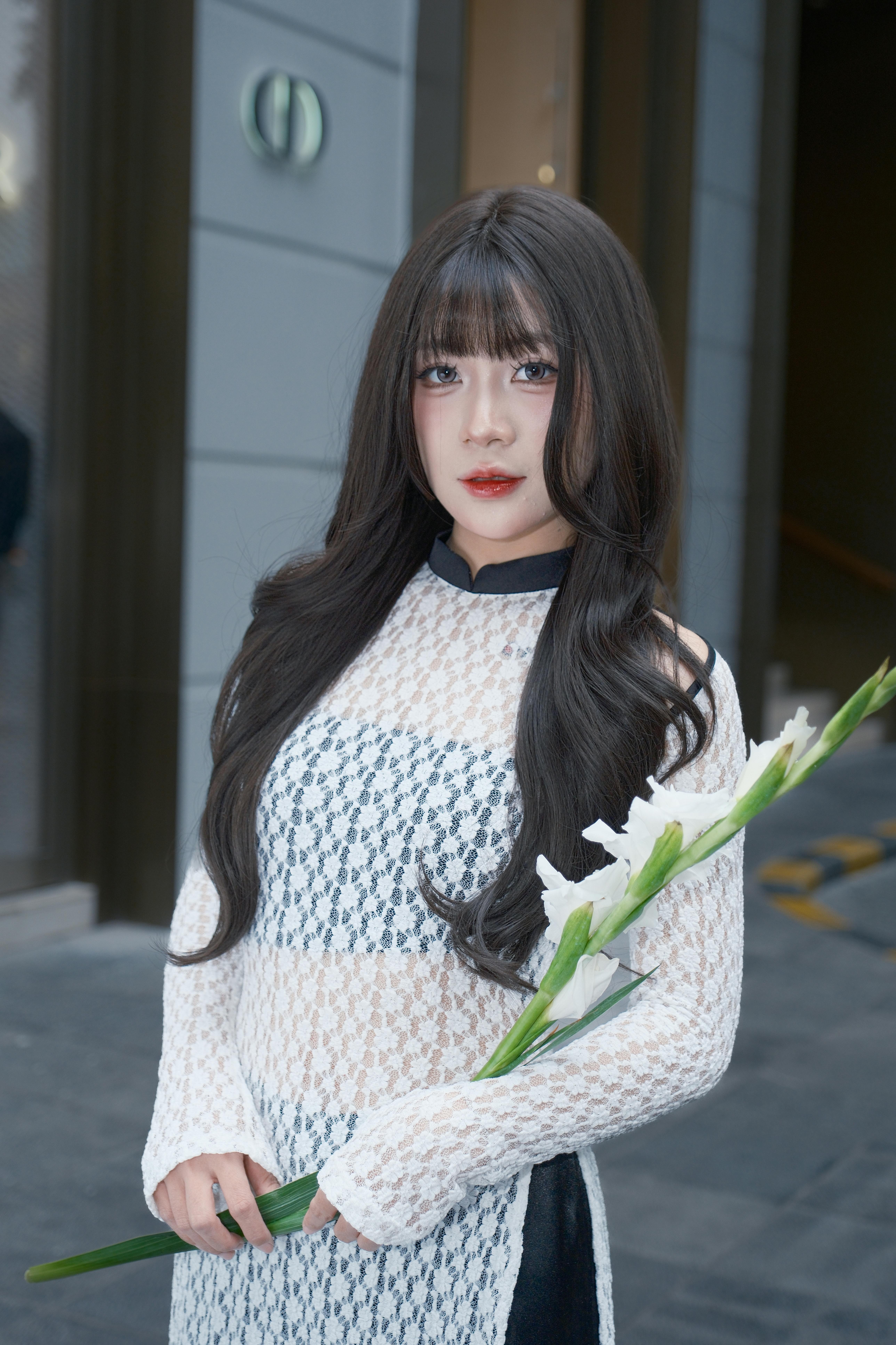 White dress, Flower Gesture, Outdoor, Hallway
